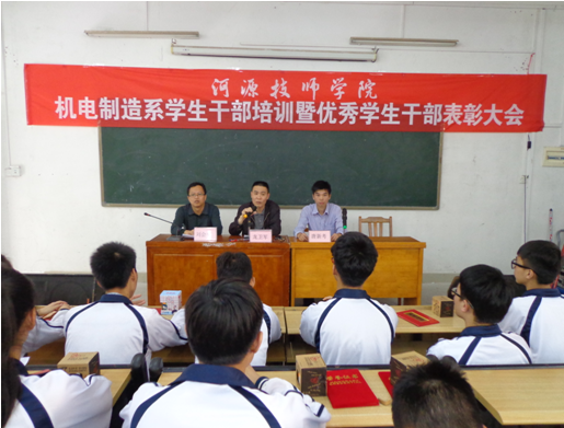 2015-04-24机电制造系学生干部培训暨优秀学生干部表彰大会 为了表彰先进,树立典型,促进学生会更快更好地发展。4月15日下午,机电制造系在教学楼8104室举行学生干部培训暨优秀学生干部表彰大会。机电制造系龙卫军主任、刘会平副主任、团总支书记唐新考老师及系部团总支学生会全体成员...