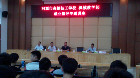 2014-11-06坐上职业快车——机械制造教学部举行就业指导专题讲座 10月29日下午,机械制造教学部在培训楼讲学厅举行2013级学生就业指导专题讲座。讲座由我校公共教学部罗卫职老师主讲。学校招生就业科谢志廉科长、机械制造教学部主任龙卫军、副主任徐勇军及该教学部13级全体学生参加了讲...
