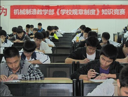 机械制造教学部举办《学校规章制度》知识竞赛为了更好践行社会主义核心价值观,让学生养成遵纪守法的好习惯,我校机械制造教学部组织14级新生于11月12日晚在8104室举办《学校规章制度》知识比赛。本次竞赛以班为单位,由各班推荐10人参加比赛。每个选手都希望能为自己班级争一份荣...