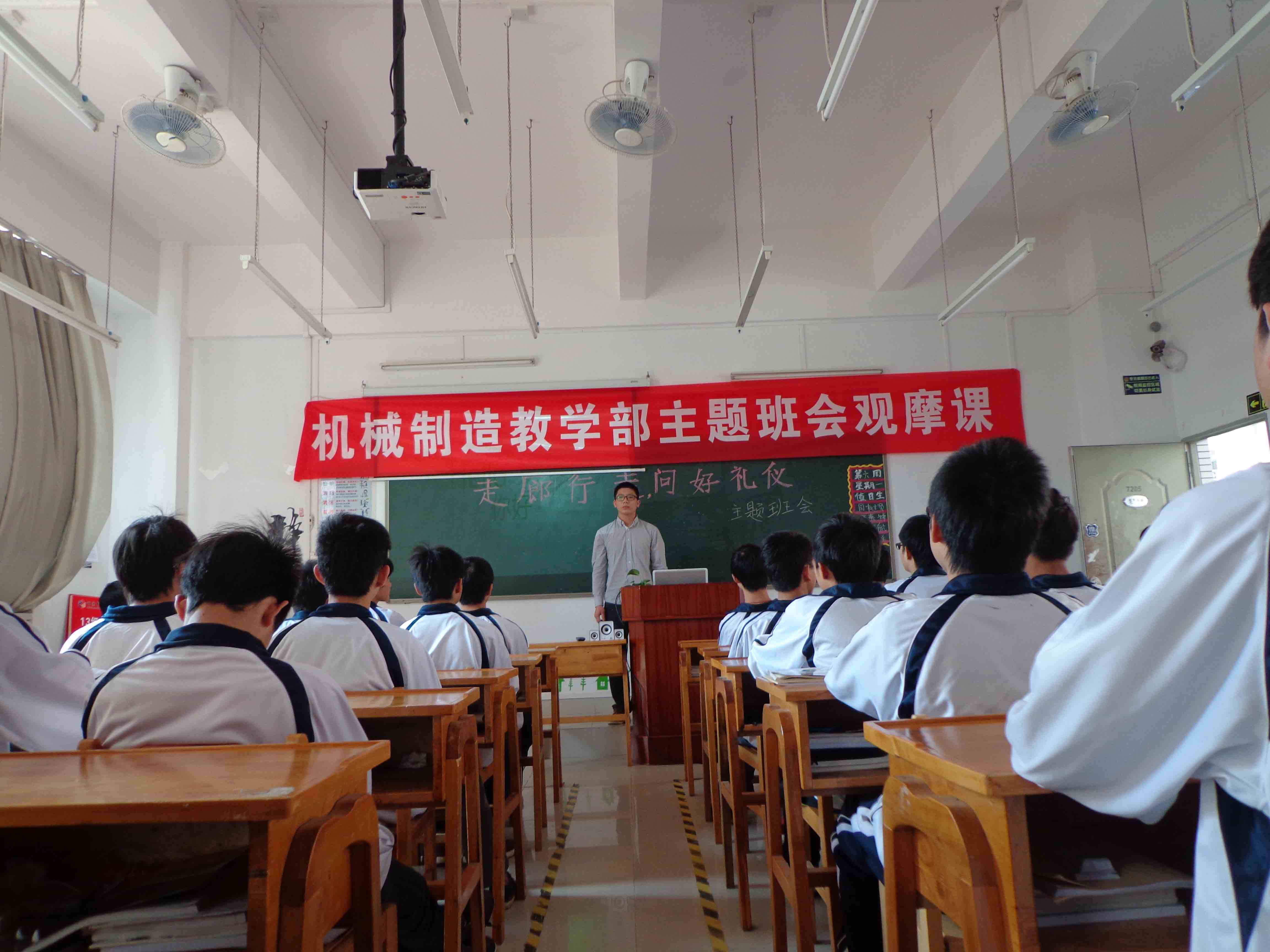 2014-04-01走廊行走,问好礼仪 ——记机械制造教学部主题班会观摩课为进一步加强德育工作的实效,落实新学期班主任工作的重点要求,3月24号下午,机械制造教学部开展“走廊行走,问好礼仪”主题班会课观摩。主讲人是13模具1班黎阳老师,机械制造教学部所有班主任参加了观摩活动。(图一...