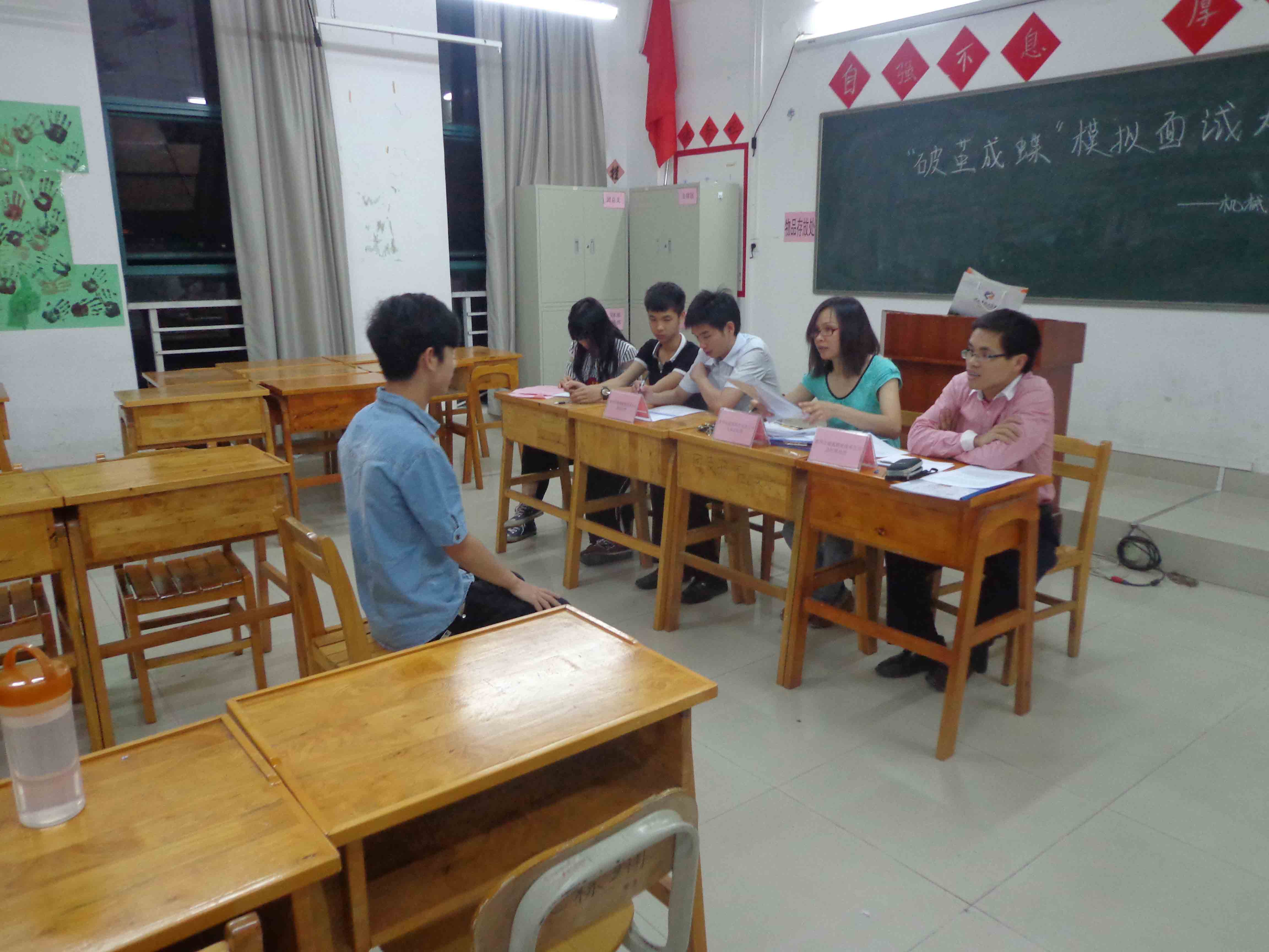 2014-05-21破茧成蝶展现自我——机械制造教学部举行模拟面试大赛 为给广大学生提供一个近距离接触招聘的平台,使其了解现代企业的招聘模式,掌握面试技巧,提高就业竞争力,4月21日,机械制造教学部在七号楼7410举办“破茧成蝶”模拟面试大赛,该教学部陈天亮、唐新考、黄碧春三位老师...