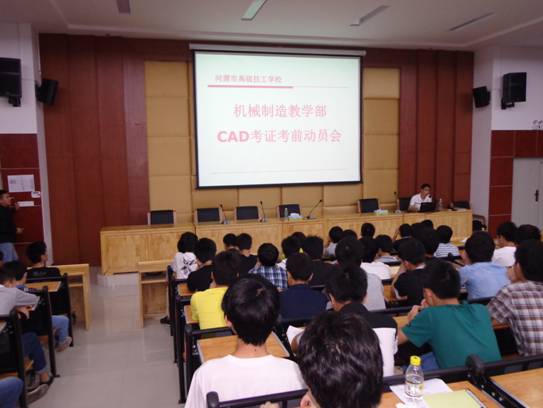 2013-08-15机械教学部召开CAD考证考前培训讲座 5月12日晚,机械制造教学部在培训楼讲学厅召开CAD考证考前培训讲座。讲座由白李平老师主讲,报考CAD考证的学生及相关专业教师参加了培训。 (图一)培训现场会上,白李平老师讲解了机械CAD考证题型、学生常见的错误、特...