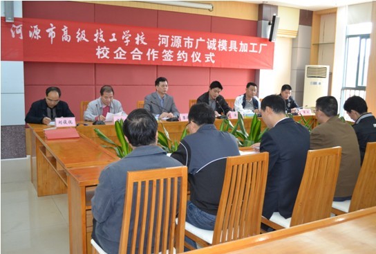 2013-04-18我校与河源市广诚模具加工厂携手共建模具制造车间 12月17日上午,我校与广诚模具加工厂校企合作签约仪式在学校一号楼大会议室举行。黎海波校长、梁秋生副校长、教务科刘俊侃科长及广诚模具加工厂黄挺厂长、李卫东总监、黄虹设计师出席了签约仪式。签约仪式由梁秋生副...