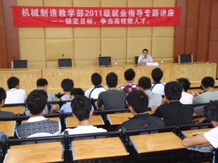 2013-04-20锁定目标 争当高技能人才——机械教学部举行2013届毕业生就业指导讲座 为加强学生就业指导工作,帮助学生树立正确就业观,4月18日下午,机械教学部在培训楼讲学厅举行2013届毕业生就业指导讲座。讲座由公共教学部万俊老师主讲,机械教学部2011级全体班主任及毕...