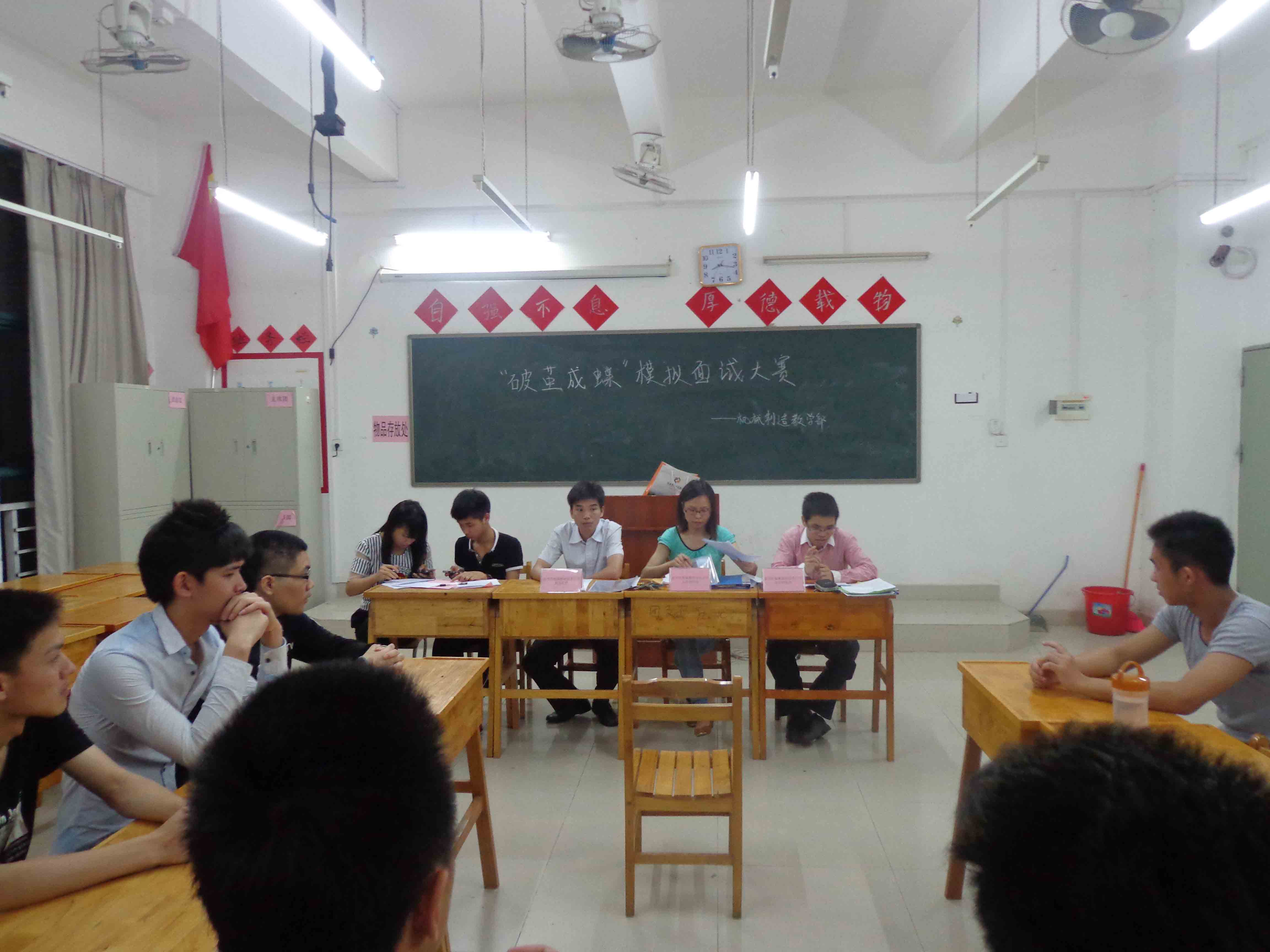 为给广大学生提供一个近距离接触招聘的平台,使其了解现代企业的招聘模式,掌握面试技巧,提高就业竞争力,4月21日,机械制造教学部在七号楼7410举办“破茧成蝶”模拟面试大赛,该教学部陈天亮、唐新考、黄碧春三位老师担任此次比赛的评委。