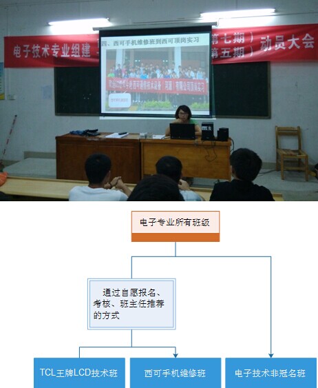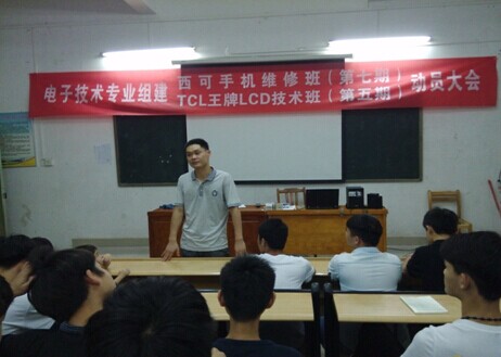 6月11日,sunbet申搏电气应用系电子技术教研组在8号楼104阶梯教室召开“西可手机维修班(第七期),TCL王牌LCD技术班(第五期)”动员大会。参加此次动员大会的有学院教务科邹坤新副科长、电气应用系钟伟东副主任、电子技术教研组组长吕秋珍老师,冠名班优秀毕业生代表刘武军、刘俏良、曾海锋,电气应用系各班班主任以及2014级电子技术专业的全体学生。