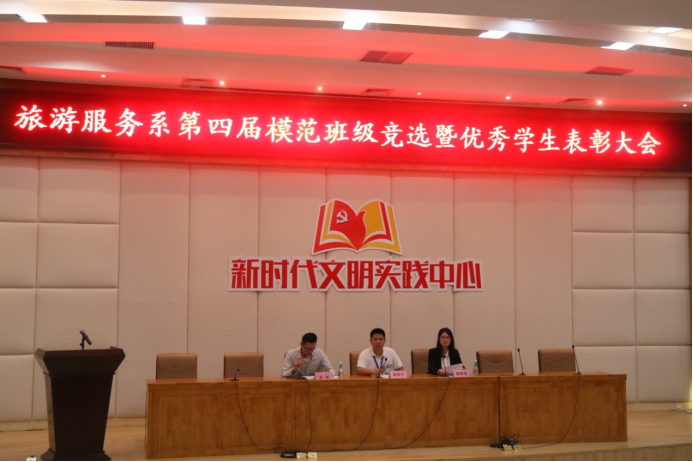 2019-04-22旅游服务系举行第四届模范班级竞选暨优秀学生表彰大会 为表彰先进,2019年4月18日,旅游服务系在学院报告厅隆重举行了第四届模范班级竞选暨优秀学生表彰大会。旅游服务系主任陈伟宁、副主任黄渊,团总支书记曾晓君出席,旅游服务系2017级、2018级全体学生参加了会议。(图一...