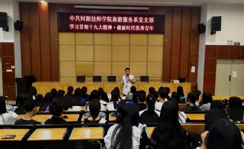 2018-05-10学习贯彻十九大精神,做新时代优秀青年——旅游服务系举行青年团员学习贯彻党的十九大精神宣讲会 2018年5月9日晚,旅游服务系在培训楼讲学厅举行青年团员学习贯彻党的十九大精神宣讲会。在旅游服务系党支部的组织下,旅游服务系党支部全体党员、团总支书记曾晓君以及系部全体...