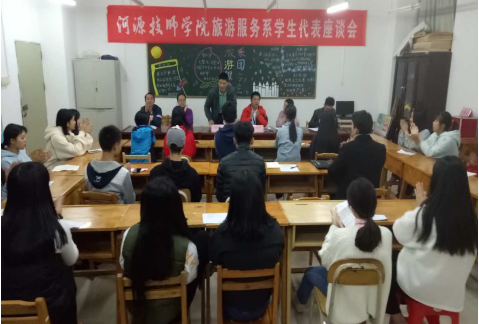 2017-12-07倾听学生心声,搭建和谐校园——旅游服务系举行学生代表座谈会 2017年11月24日晚,旅游服务系在7202办公室举行了学生代表座谈会。系部谢龙桂主任、罗丹副主任、陈伟宁副主任、黄渊老师、曾朝萍老师、谢志海老师及各班学生代表参加了本次会议。 (图一)座谈会现场一&...