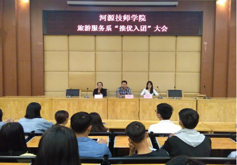 2017-11-06旅游服务系举办“推优入团”大会 2017年11月2日晚,旅游服务系在讲学厅举办“推优入团”大会,旅游服务系副主任罗丹老师、副主任陈伟宁老师、团总支书曾晓君老师出席,竞选人员以及各班班长参加了此次大会。(图一)会议现场(图二)班长上台为本班竞选人员评议(图三)学生...