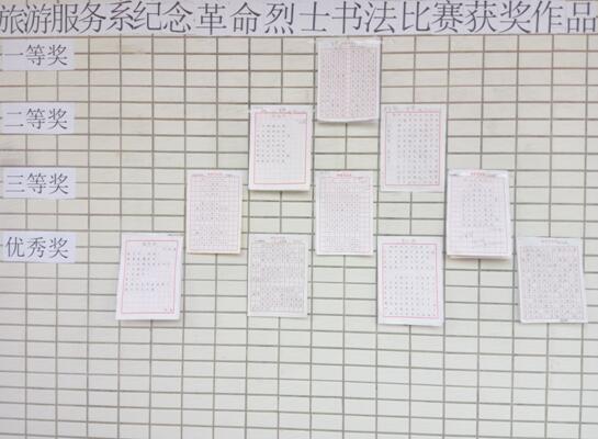 2017-05-30旅游服务系“传承五四精神 展示青春风采”纪念五四运动98周年系列活动之三: 旅游服务系举办“纪念革命烈士”书法比赛 为缅怀革命先烈,继承革命先烈的光荣传统,弘扬爱国主义精神。旅游服务系举办“纪念革命烈士”书法比赛。(图一)获奖作品 &n...