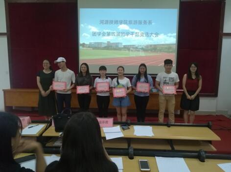 2017-05-18旅游服务系举办团学会干部换届大会 5月17日下午,旅游服务系在1号楼阶梯教室举行了团学会第四届换届大会。参加此次大会的评委有旅游服务系副主任罗丹老师,旅游服务系团总书记曾晓君老师以及旅游服务系第三届团学会主席团成员。 (图一)颁奖现场(图二)2015届团学会...
