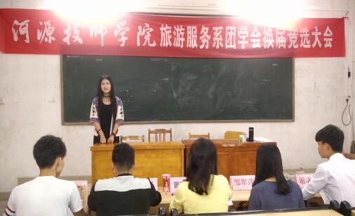2016-04-17旅游服务系举行团学会换届竞选大会 2016年4月13日下午,sunbet申搏旅游服务系团学会在8104阶梯教室举行了团学会换届竞选大会。旅游服务系团总支书记曾晓君老师、旅游服务系2014级团学会干部以及2015级团学会成员共60余人参加了会议。 (图一)竞选同学发言(图二)竞选现场会...