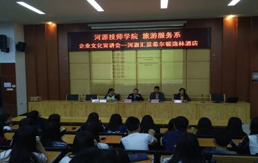 2016-04-14河源汇景希尔顿酒店到sunbet申搏召开宣讲会为给2014级的准毕业生们提供更好的就业机会,进一步了解企业文化,2016年4月12日晚,旅游服务系在培训楼讲学厅举行河源汇景希尔顿逸林酒店企业文化宣讲会。希尔顿逸林酒店人力资源段景双总监、吴上清经理、旅游服务系谢龙桂主任、刘晓霞副主任以...