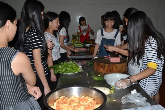 2015-06-16女神毕业季系列报道(二)——记13幼师4班“欢乐聚”自助餐晚会 “饺子是这样包的,拉住中间的皮,对折,压紧,然后用左手托住饺子皮,用右手拉住上皮,折叠按压……”“先把黄瓜、土豆、苹果洗干净,准备拍黄瓜、炸薯条……”“桌子擦干净了吗?饭煲好了吗?……”6月12日下...