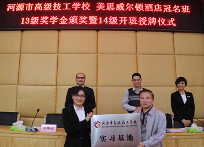 我校举办2014级“美思威尔顿”冠名班授牌仪式 11月19日,我校“美思威尔顿”冠名班授牌仪式在培训楼讲学厅举行。学校梁秋生副校长、校企合作办邹坤新主任、万绿湖美思威尔顿酒店常务副经理肖辉生先生、副总经理杨少辉女士、人力资源部总监周玉林女士等人出席了授牌仪式。(图...