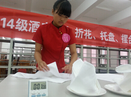 2014-11-17指尖上的魔术--旅游服装教学部举办第三届餐巾折花大赛决赛 为了增强同学们对本专业的兴趣,提高专业技能,为今后省市级技能比赛挖掘好苗子,旅游服装教学部举办第三届餐巾折花大赛。经过初赛选拔,决赛于11月13日下午举行,由12名同学分成3组在最短时间内完成指定餐巾花盘花...