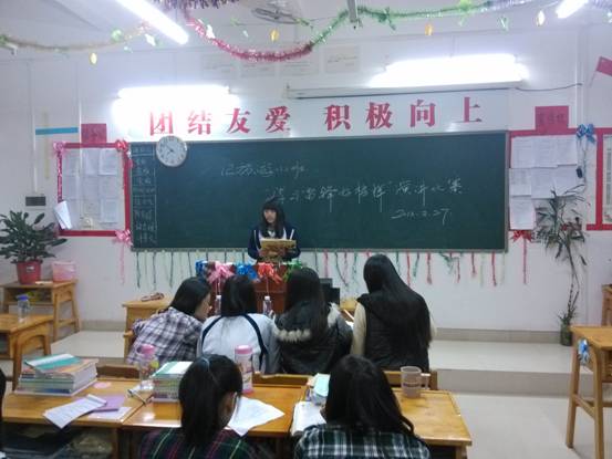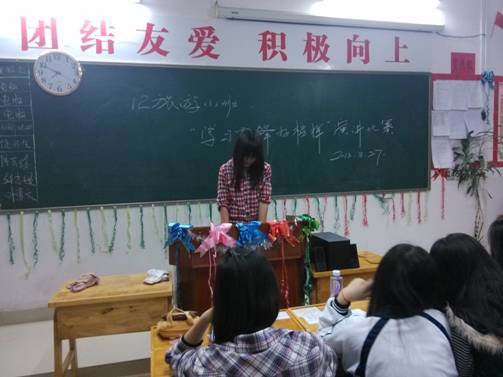 3月27日晚自修,该班全体成员,在本班课室7403开展“学习雷锋好榜样”朗诵比赛。本次比赛经过全体班委和老师的精心准备,全班共有19名学生参与。比赛效果良好,取得了优异的成绩,共产生一等奖1名,二等奖2名,三等奖3名;其中一等奖被劳动委员黄轲梵以26.8分高分所夺得。叶鸿安同学以25.7的分数屈居第二。