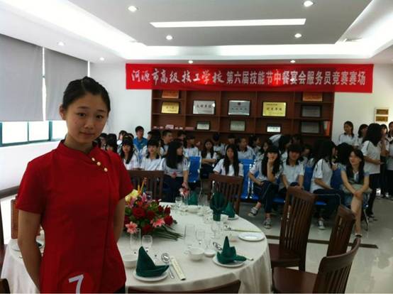 5月29日上午,我校旅游服装教学部在七号楼一楼举行第六届技能节中餐宴会服务摆台技能比赛。
