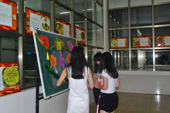 (图二同学们在布置现场,贴上手工做的装饰字)