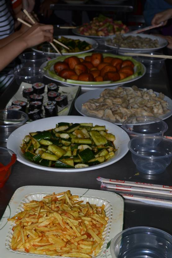 接近6点,邀请的任课老师如期抵达现场,同学们把煮好的水饺、红薯糖水,拌好的拍黄瓜、水果沙拉,包好的紫菜卷,做好的可乐鸡翅、蛋糕,炸好的馒头、薯条一一端出来,香气扑鼻,引得老师们频频称赞,还拿出手机拍拍拍。