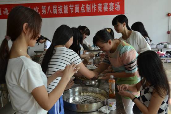 6月12日下午,在学校烹饪实操室传来一阵又一阵的说话声,各个都洋溢着幸福的笑脸,原来是13幼师4班的女生和几个烹饪班的技能高手,在为“欢乐聚”自助餐晚会做准备。