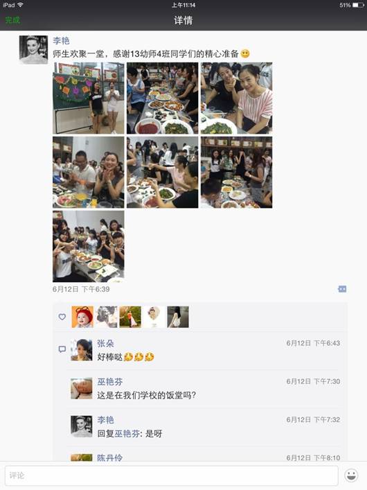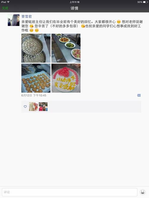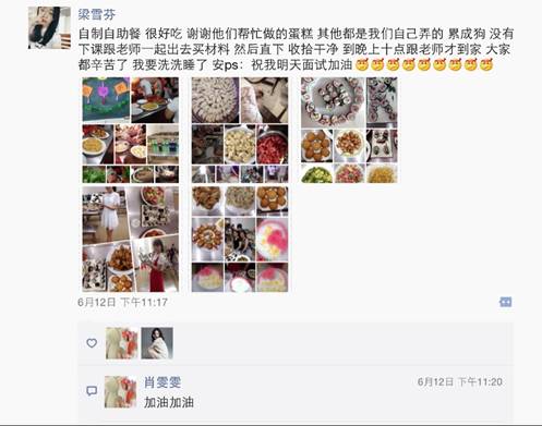 同学们和老师在晚会结束后,纷纷在朋友圈中晒出今晚的美食和自己的感想,表达即将离别的伤感情绪,和对学校的感激之情。