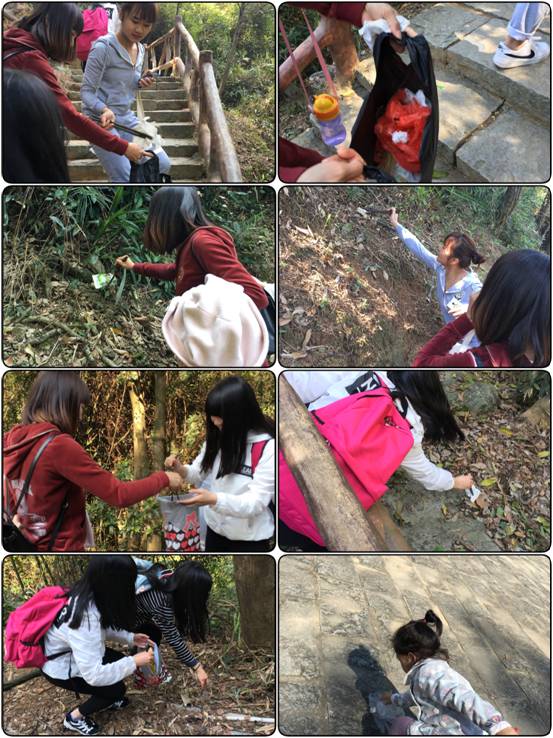 前段山路都是柏油路,有清洁工在打扫,地面干净,队伍慢慢行至山脚下,垃圾渐渐出现,同学们赶紧拿出准备好的垃圾袋,用路边断弃的树枝做成“筷子”,夹拾路边的垃圾。有些垃圾被丢弃得比较远,同学们依然不怕危险,俯身探手势在必得要将垃圾清干净!