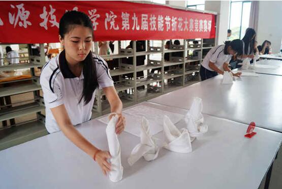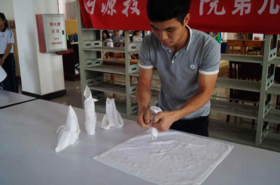 折花大赛项目是酒店专业学生的必修科目,同学们需要在规定时间内将餐巾折出不同造型,有动物造型的、花朵造型等,考验同学们的基本功和耐心。