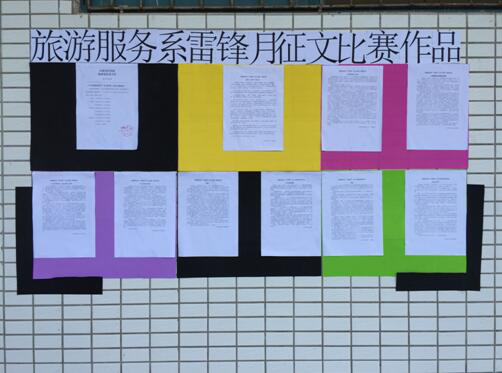 为大力弘扬社会主义核心价值体系,弘扬雷锋精神,提升学生素质,旅游服务系于2017年3月举办了“学雷锋”征文比赛。此次活动面向旅游服务系全体同学,各班同学都非常积极参加。