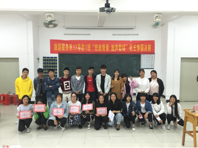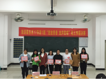 11月6日下午,旅游服务系2017级导游班全体学生在培训楼声乐室举办了歌王争霸决赛。班主任陈丹伶老师、谢丽娟老师出席了本次活动。
