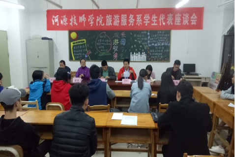 2017年11月24日晚,旅游服务系在7202办公室举行了学生代表座谈会。系部谢龙桂主任、罗丹副主任、陈伟宁副主任、黄渊老师、曾朝萍老师、谢志海老师及各班学生代表参加了本次会议。