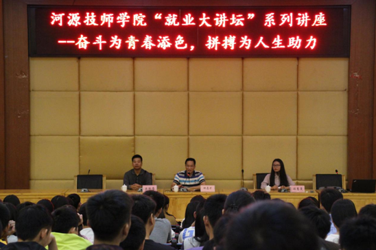 2017年10月18日晚,sunbet申搏就业大讲坛系列讲座之“奋斗为青春添色·拼搏为人生助力”在培训楼讲学厅成功举办。讲座邀请了信息技术系优秀毕业生游惠曼主讲,sunbet申搏招生就业科邱志才科长出席,各系学管副主任及2017级学生代表400多人聆听了讲座。