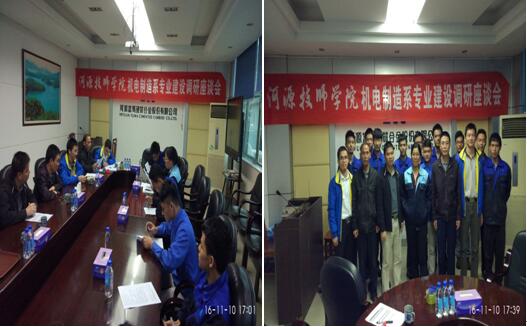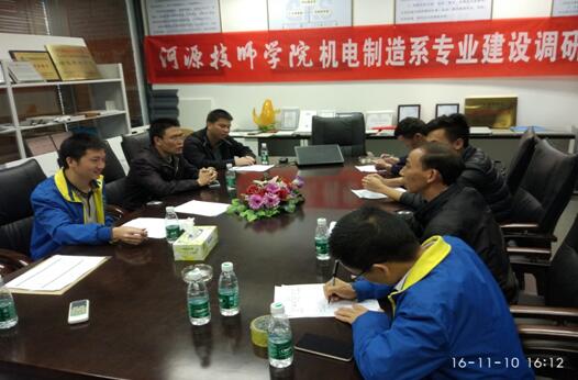 为做好机电制造系模具制造、数控加工技术、机电一体化专业对接企业的人才培养方案、顶岗实习管理、就业安排等方面工作,2016年11月10日至18日,机电制造系龙卫军主任、刘会平副主任、黄志平副主任,模具制造、数控加工技术、机电一体化专业的教研组长和专业老师一行10人,分组到河源富马硬质合金股份有限公司、广州金霸(河源)建材有限公司、农夫山泉股份有限(河源)公司、长江家具(河源)有限公司、河源雅达电子有限公司等企业开展专题调研工作。